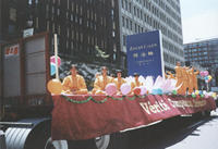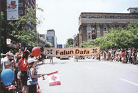 上午十一点,游行活动在10万名观众的期待中正式开始。在色彩鲜艳的英、法文横幅“真、善、忍”、法轮图形和大型“FalunDafa”横幅的引导下,在<<普度>>的音乐声中,缓缓地驶来了学员们精心装饰的大型彩车。绒布的深红色把彩车妆扮得庄重而有生气,两侧金黄色的“真、善、忍”(法文)格外醒目;似乎飘乎于蓝天白云之上的巨型莲花,托起的是2.4米高的<<转法轮>>(法文版)模型;十几位学员舒缓地演炼着五套功法。在彩车之后,行进中的近三十名学员,手执标有“真、善、忍”和“法轮大法”的彩旗及各色气球。场面祥和宁静,气氛感人至深。所到之处受到观众的热情欢呼,很多人竖起拇指向学员致意,许多人不断重复地喊着“Falun Dafa”,一些人追着彩车摄影录像,更多的人则是主动询问大法情况、索要大法资料。由于事前被告知,游行时不得主动派发资料,所以学员携带的资料不多;未料到索取资料者众多,在游行开始不久,所带英法文资料即被散发一空,立即复印也无法弥补即时所需。