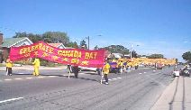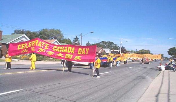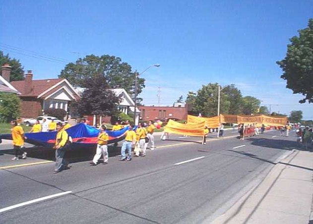 10点半左右,East York 大游行开始。整个游行队伍约有1公里,其中法轮功部分就有100多米,我们被安排在整个游行队伍的尾部,跟在一个军乐队的后面,十分引人注目。当学员们伴随着优美的普渡音乐开始游行时,法轮功的队伍很快成了游行队伍中的主角。在法轮功队伍的前部,是加拿大国旗和“庆祝加拿大国庆”的大横幅,随后是一个巨大的法轮图形、介绍法轮大法及真善忍的大标语等。