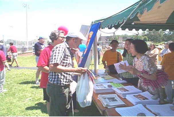 游行最后在EAST YORK的一个公园里结束,学员们就在预订好的位置开始弘法和炼功,来往不绝的人们取走了很多报纸和宣传材料。虽然烈日炎炎,但学员们安详自如的动作吸引了很多人,有的马上来学打坐。