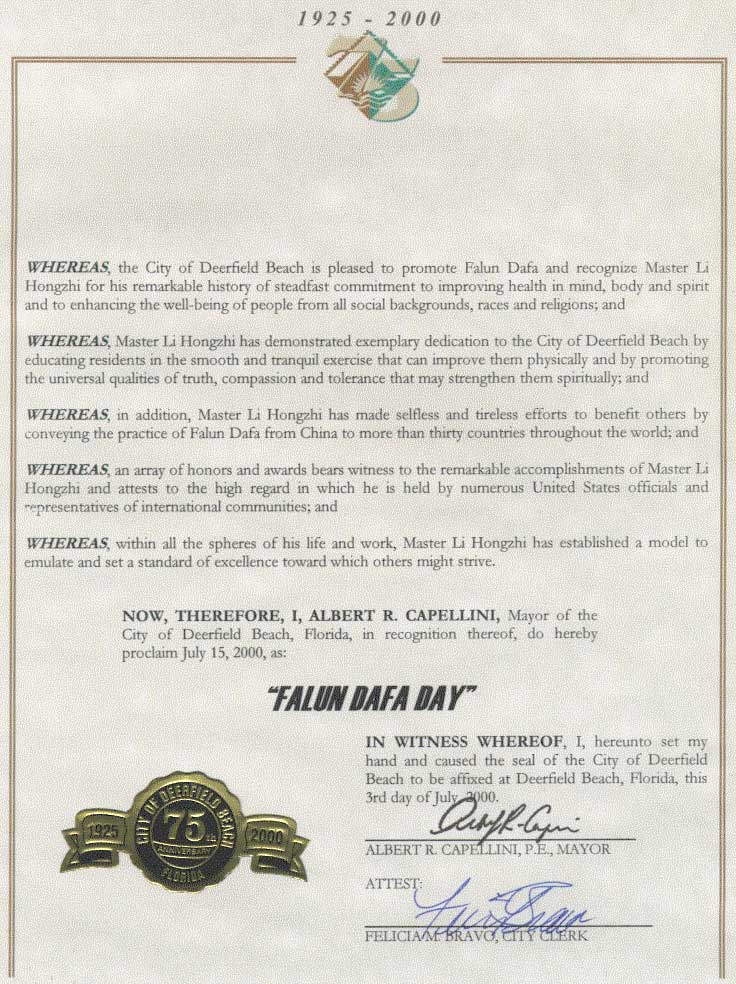 【明慧网2000年7月9日】 佛罗里达州鹿原滨城宣布2000年7月15日为“法轮大法日”