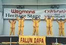 与往年不同,今年主办单位新增了一项节目,“民族传统村”,邀请当地不同民族传统的群众上台表演代表他们民族传统文化的节目。参加集市的法轮功学员被邀请第一个上台表演五套功法。五位学员身穿金黄炼功服,庄严而优雅地向观众展示了功法。与此同时,一位白人学员在台下简单扼要地向大家作了功法介绍。台上表演结束后,学员们当场邀请观众学炼法轮桩法,场面生动活泼。