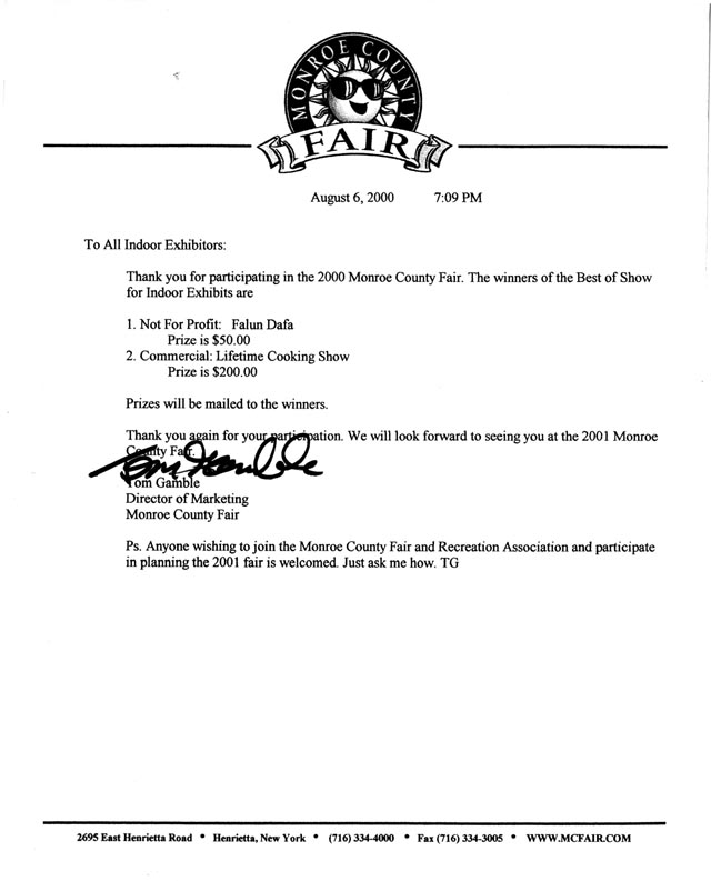 五天的洪法活动很快就结束了。学员们在“民族传统村”的出色表演,参展展位的布置,在整个集市活动中注重公德的文明举止,和对主办单位的尊重及配合,都受到一致好评。集市最后一天,主办单位推选参展优胜者,法轮功被评为非利润组第一名,并授予五十美元的奖金。学员当场把奖金捐给了主办单位所设立的一个奖学金基金。事后有学员想到,今后如果再有这样的事,我们完全可以用奖金购买大法资料送给各地图书馆或者有缘来得法的人们。
