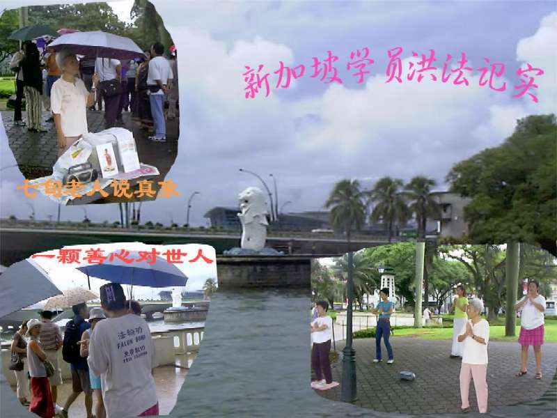 大家把一些图片和法轮大法的中英文简介放在台子上供游人自取,遇到来自中国大陆的游客,学员们主动热情地上前介绍,有的游客明显地改变了态度,与我们聊起来,说:“其实我们没觉得法轮功不好,只是你们真相信开天目、上天吗?”有的人微笑着接过简介,说:“我听说过,我会看的。”也有的人拒绝接受真相资料,大家为他们感到惋惜。还有一个上小学的孩子,刚开始用冷漠的眼光看着我们说:“我们那儿都不炼这个,你们还炼?”学员们看到这样小的孩子的心灵都受到了污染真感到心痛,连忙向他介绍说明:“法轮功是好的,在这里是合法的,在全世界都有许多人在炼,你读一读介绍吧。”听了这些话,他的眼神变了,把放下的简介又拿起,走了。一位七十多岁的新加坡学员打着伞为摆放的资料挡雨,并向中国游客介绍说:“我们炼功,好啊,是修炼。”是啊,她满头的白发在渐渐变黑,多年固疾不药而愈,她能不发自内心地讲出真相吗?这朴实而简单的话语令人心动。观看的人们怎能不想想,是什么力量使这些人放弃休息日,在这里迎着风雨顶着风险呢?