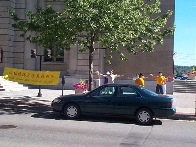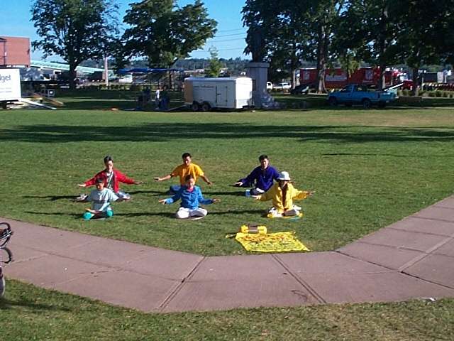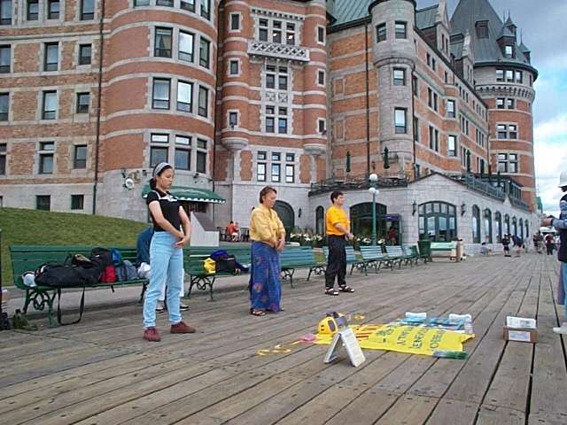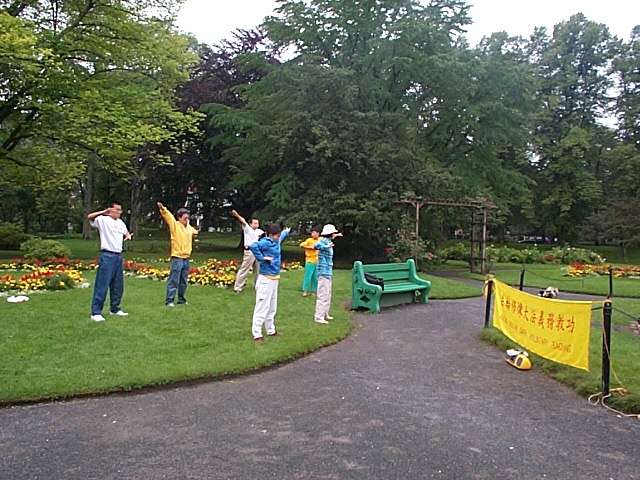 中午前后,我们来到一处热闹的风景点洪法炼功。(见图)来自世界各地的游人在我们面前川流不息,很多人停下来看我们炼功,他们静静地看着我们,我们就把有关法轮功真象的资料送给那些长时间注视我们的人。在不远处有一个街头卖唱者,他在弹奏着刺耳的摇滚乐。当他察觉很多人的目光停留在我们身上时,就很不满意地与管理人员协商让我们退到了一块不很显眼的草地上。然而,这样做只能使好奇的人们更仔细的观察我们。