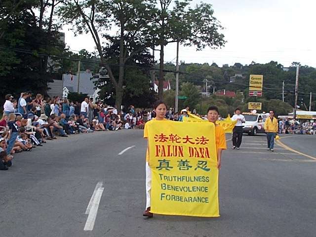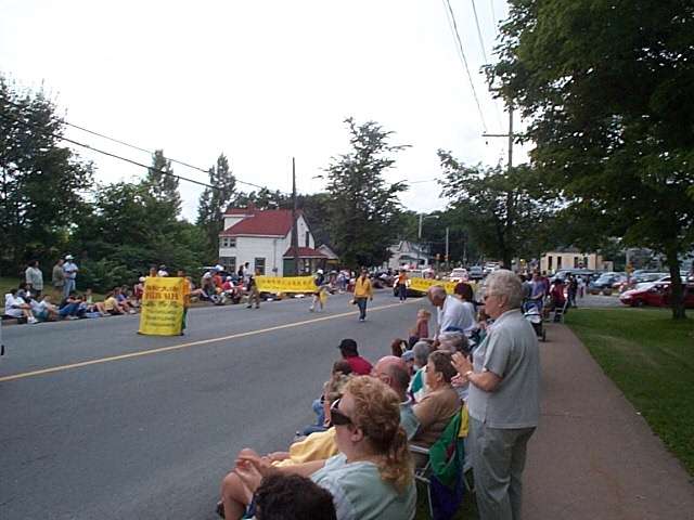 8月7日是市民节日, 哈利法克斯地区将有大型的游行。尽管我们一共只有十来名学员,事先也没有申请加入游行,但是大家一致认为一定要把握住这次宝贵的洪法机缘,让更多的世人知道真相。当天清晨,两个学员提前赶到了游行出发地向组织者提出申请加入,并很快获得了批准。消息传来,我们在家等待的几个人迅速出发赶向集合地点。由于人生地不熟和一些道路的提前封闭,我们迟迟无法赶到出发地点。时间一分一秒地过去,马路旁挤满了人群,至少有10万人,我们甚至看到了开路的马队已经走过来了。最后,在两位热心人的指引下,我们终于赶到了出发地。这时,游行队伍已经出发了一半,我们打开了印有中英文“真善忍”、“法轮大法”和“法轮大法义务教功”的金色横幅,放起“普渡”音乐,井然有序地插入了游行队伍。