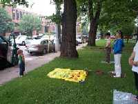 下午,天下起了大雨。我们来到了一个公园与另外几个哈利法克斯的学员会面。这里正在举办一个露天音乐会,市长也会出席。其中,有两个新学员很早就来了,为了等我们,她们的衣服都湿透了。我们就留下一位学员与市长会面,赠送资料。其余人回到当地学员提供的小会议室交流心得体会。