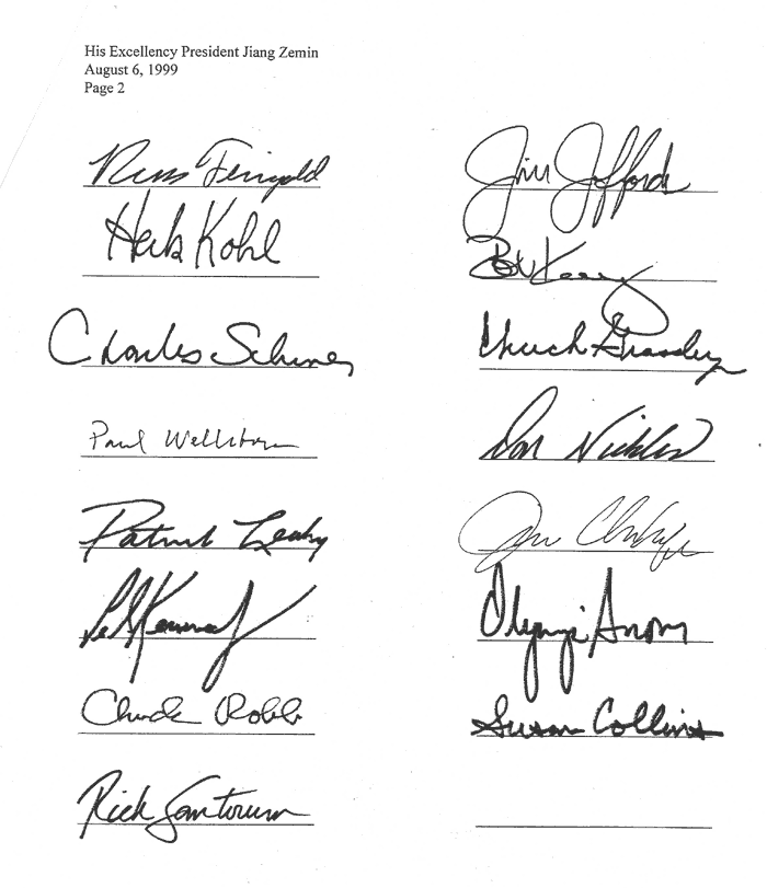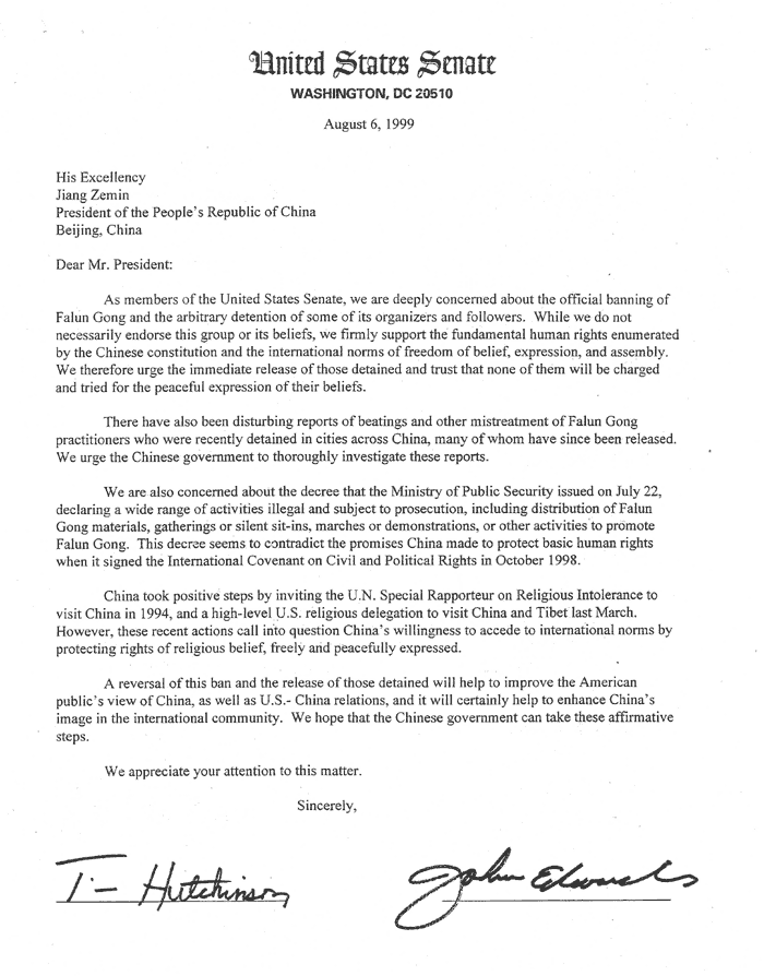 As members of the United States Senate, we are deeply concerned about the official banning of Falun Gongand the arbitrary detention of some of its organizers and followers. Whilewe do not necessarilly endorse this group or its beliefs, we firmly supportthe fundamental human rights enumerated by the Chinese constitution andthe international norms of freedom of belief, expression, and assembly.