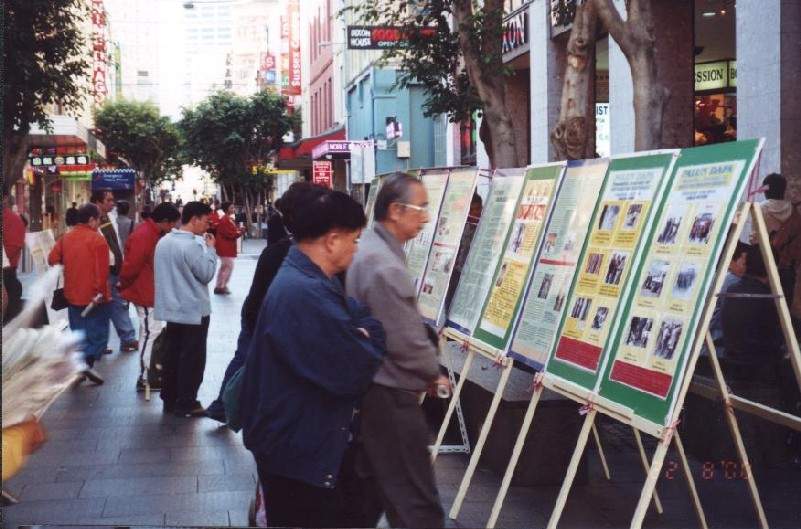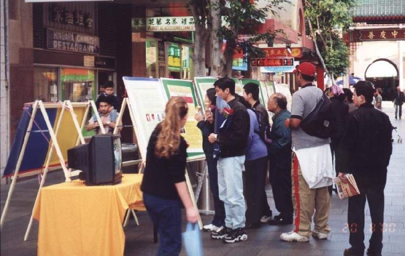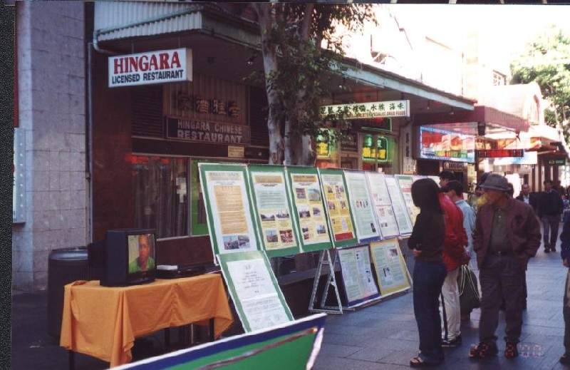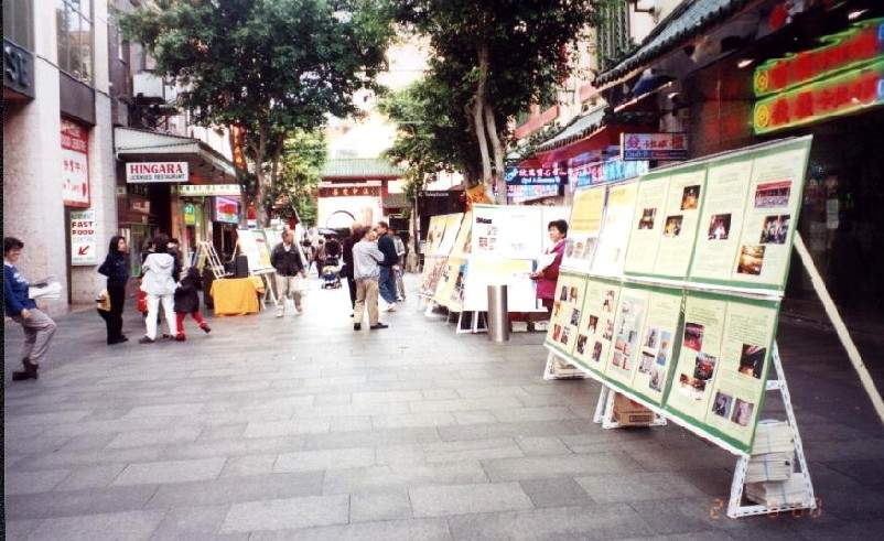 悉尼是闻名于世的旅游城市,正值奥运会的到来,游客众多,中国城靠近悉尼的著名旅游区达令港,观光者多在此驻足,故展览设在中国城的步行街是最佳位置。学员们在步行街一侧播放的录象“法轮功真相”,另一侧的图片展,以及部分学员所展示的五套功法不断地吸引着游人观看及询问。