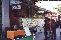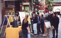 中国城是中国旅游团必到之处。由于中国的一言堂的宣传,使这些中国游客对法轮功真象所知甚少,当他们看到这些图片时都很惊讶,有的说:看炼功的还有白人呢;你看这幅照片是当年那么多人炼功的场面;看那幅,给他们打得真够惨的;录相上的真人真事在国内可看不到,看来法轮功是真的!有的学员对中国的游客说:“中国的大好河山那么多为何还出来旅游呢,因为就想看中国没有的,这些在中国可看不到。”,游客也笑了:是啊!有的旅游团象是单位组织的,领队模样的人一进唐人街就说:“谁也不许要那些资料”,可还是有一些不为所动来索取资料的,就连领队模样的人也禁不住放慢了脚步目不转睛地看着图片展,从那疑惑的目光中能看出他们的几分茫然,纸是包不住火的。