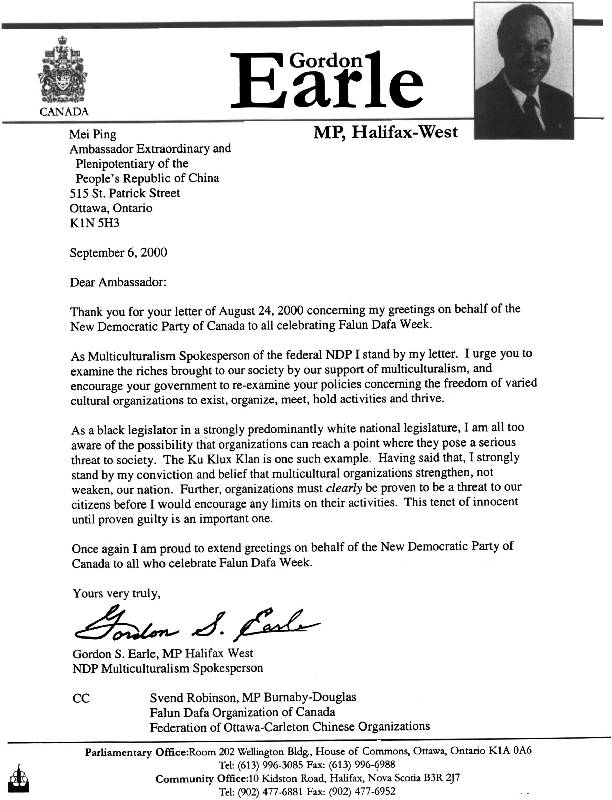 作为加拿大新民主党多元文化发言人的国会议员戈登·厄尔8月14日代表新民主党向加拿大"法轮大法周"发来贺信, 称誉法轮大法学员力求内心平和, 同化宇宙, 善心待人; 法轮大法帮助缔造一个开明及宽容的社会.