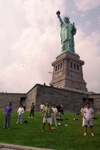 节日的小岛热闹非常,过往游客摩肩接踵。在这方圆几百公尺的小岛上,几乎能看到世界上各种种族、国家的游客,能听到各种不同的语言。学员们拿出自带的小录音机,在自由女神像下的草坪上开始炼功。