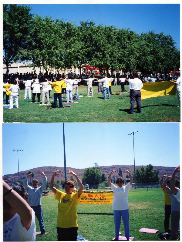 9月23日,住在秋罗.维斯塔的美国学员凯文打电话来,说是有一个一年一度的社区活动,有游行,是一次很好的弘法机会。我们两个中国学员和两个美国学员赶到那儿。正好游行结束。我们迎着离去的人群发放大法资料。一个多小时就发了近千份。有人还停下脚步详细询问了有关法轮功的问题并表示对我们的支持。