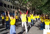 学员们身上穿着印有 “CHINA:STOP PERSECUTING FALUNGONG (中国:停止迫害法轮功)”、 “法轮大法好”及“CHINA:FREE THE JAILED FALUN GONG PRACTITIONERS (中国:释放被关押的法轮功学员)”等字样的黄色T恤衫。