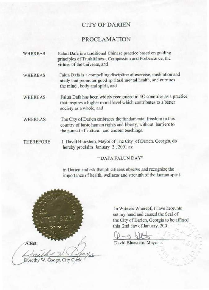 【明慧网2001年1月11日】 乔治亚州德瑞市宣布2001年1月2日为“法轮大法日”