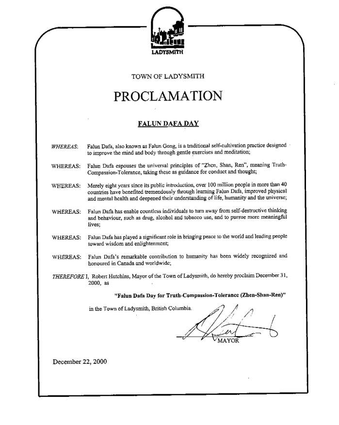 【明慧网2001年1月11日】 加拿大不列颠哥伦比亚省的雷迪斯密丝镇宣布2000年12月31日为“法轮大法真善忍日”