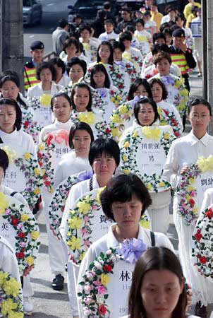 走在队伍最前面的是120位身穿白色衣服( 中国哀悼颜色)的人们,她们手举120名被害法轮功追随者的照片,据此团体称,他们都是在大陆中国警察拘押期间被折磨致死。