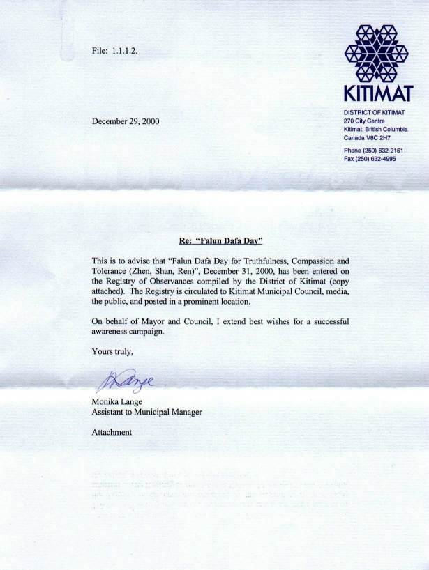 【明慧网2001年1月17日】 不列颠哥伦比亚省可地梅特区宣布2000年12月31日为“法轮大法真善忍日”