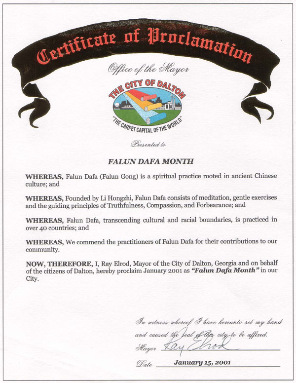 【明慧网2001年1月19日】 乔治亚州戴尔顿市市长宣布2001年1月为“法轮大法月”