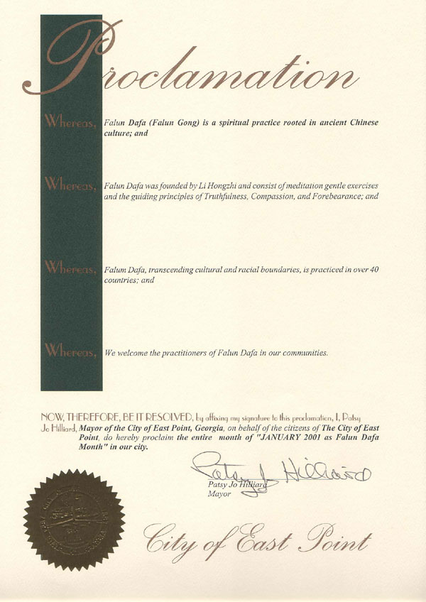 【明慧网2001年1月19日】 乔治亚州东坡尔特市市长宣布2001年1月为“法轮大法月”