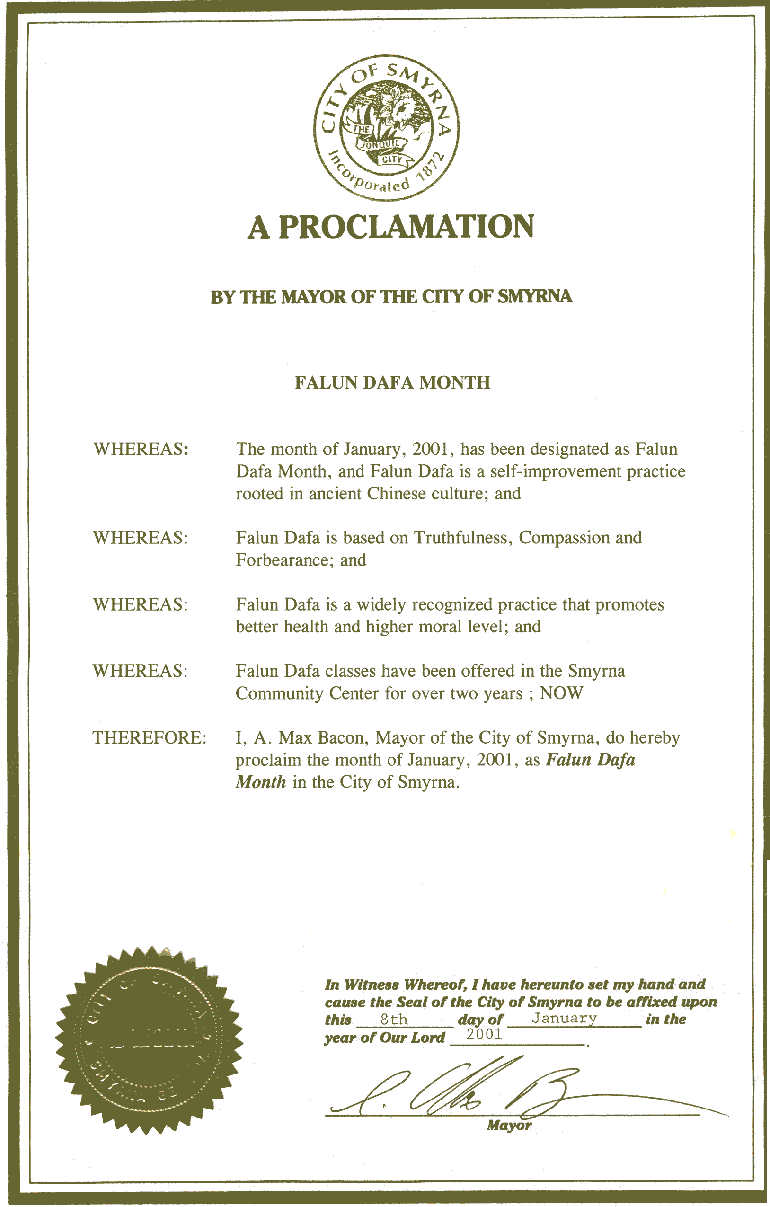 【明慧网2001年1月19日】乔治亚州斯马瑞纳市市长宣布2001年1月为“法轮大法月”