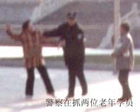 这时人群又向东南角涌去,原来是五个韩国功友打出两条三米长一米宽的横幅,上边写着韩国字。横幅很快被夺走,五个功友都被打倒在地。不一会儿一辆已满载功友的警车鸣着喇叭开过来,便衣们把五个功友连踢带打的硬塞到车里拉走了。