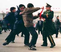 中国警方以粗暴方式镇压元旦在北京天安门广场举行抗议的法轮功成员,拘捕了至少二百人。包括很多便衣警察在内的数千名警察在广场上使用暴力对付法轮功成员,至少有二十辆警车停在一旁等待载运被拘捕的人。