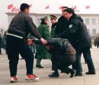 中国当局在天安门广场部署了数以千计的士兵和警察,以逮捕在广场打出法轮功横幅或呼喊法轮功口号的一批又一批的抗议者。