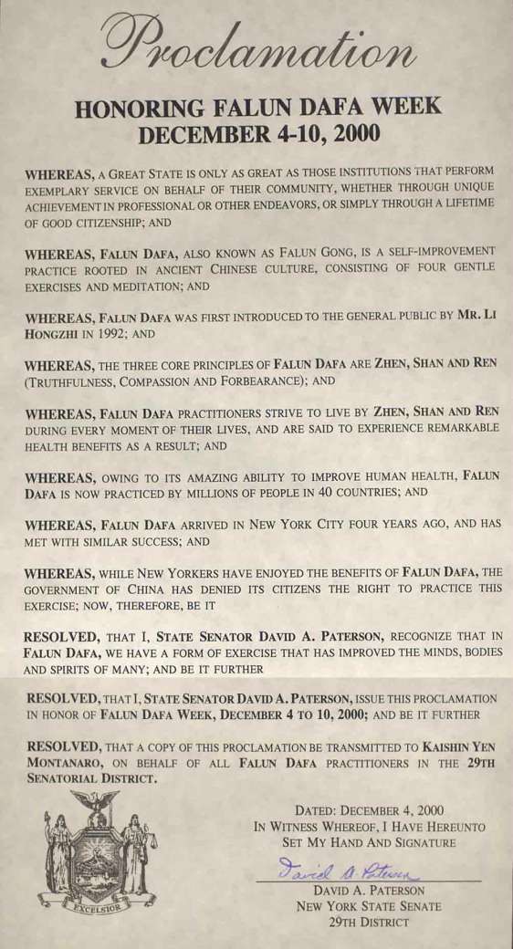 【明慧网2001年1月20日】 纽约州29选区参议员宣布2000年12月4-10日为“法轮大法周”