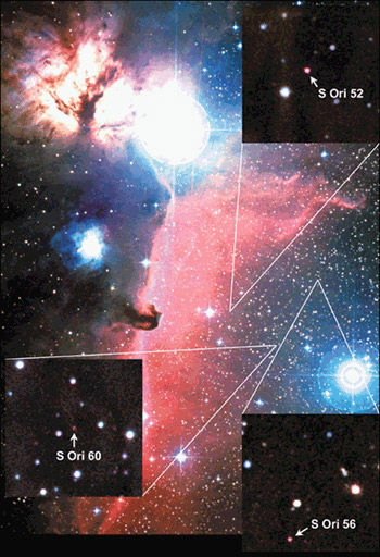 图注:大海捞针,18颗新行星中的3个:右下方最亮的星体周围区域是猎户星座中的一星团。方框标出三个可能的行星,每个是木星的5到15倍大。