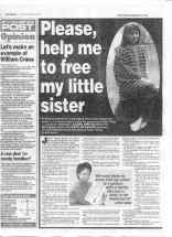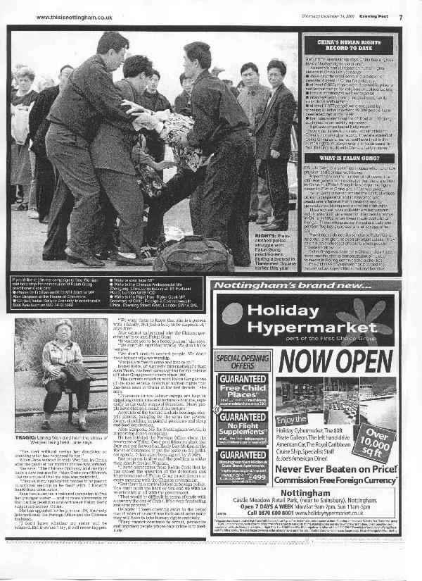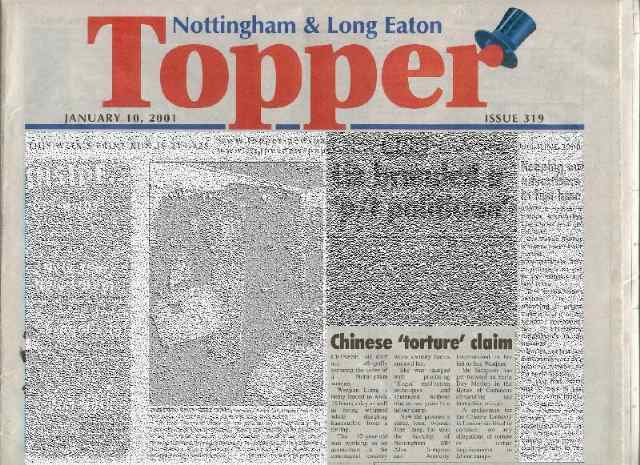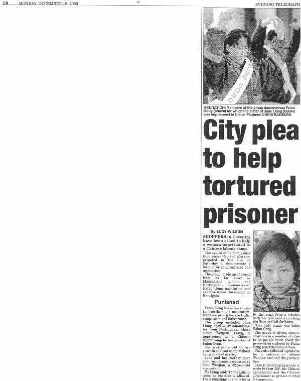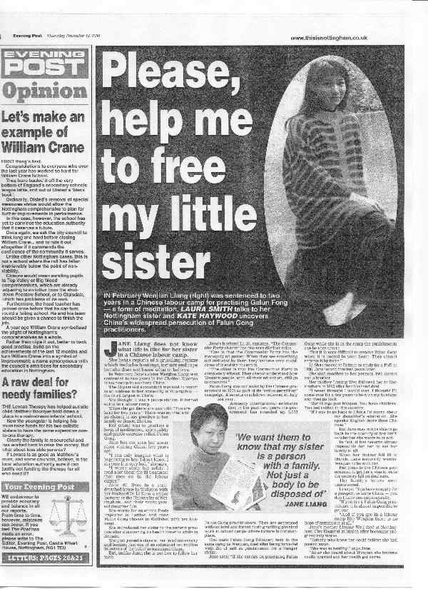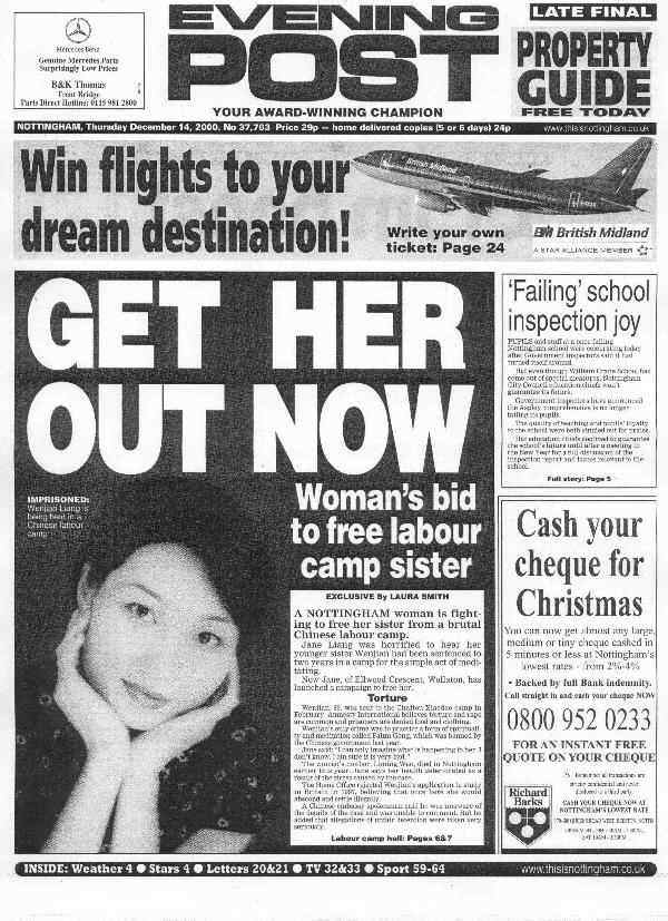 【明慧网2001年1月21日】 英国多家地方报纸最近一个月纷纷在头版或其它明显位置刊登文章,同情并帮助营救一位英国学员的因炼法轮功在广州被劳教两年的妹妹梁文坚。(见附图)