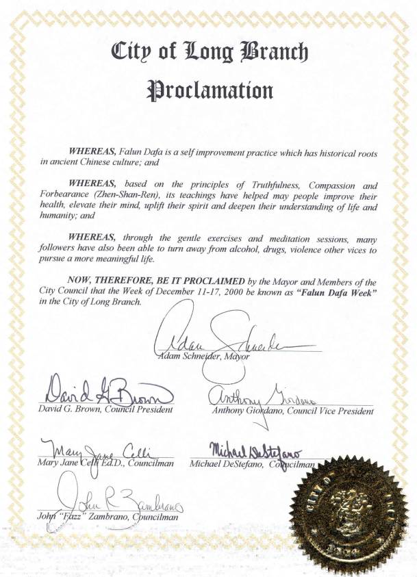 新泽西州长枝市公告宣布“法轮大法周”