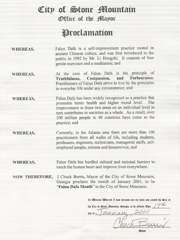 【明慧网2001年1月23日】 乔治亚州石头山市宣布2001年1月为“法轮大法月”