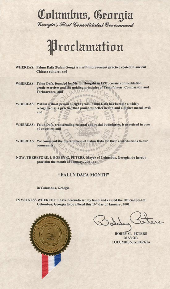 【明慧网2001年1月23日】 乔治亚州哥伦布市宣布2001年1月为“法轮大法月”。