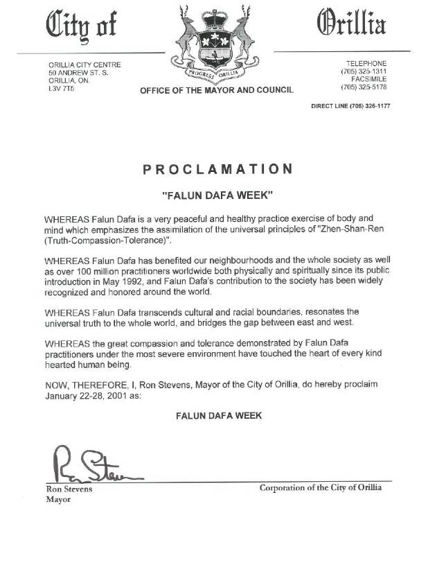 【明慧网2001年1月25日】 加拿大安大略省奥瑞里亚市宣布2001年1月22-28日为“法轮大法周”