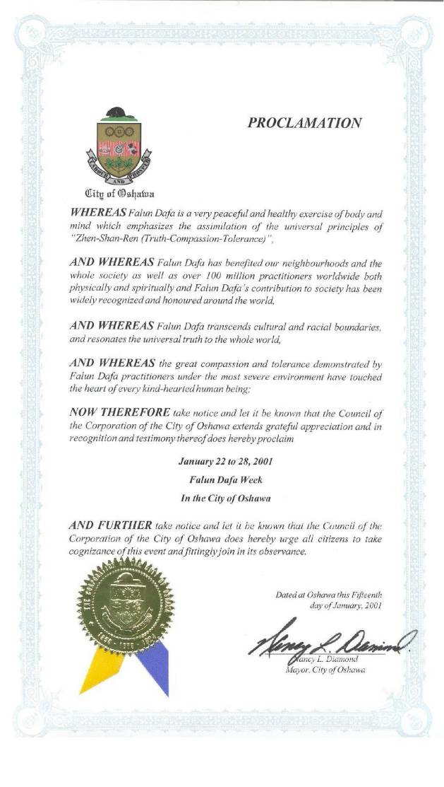 【明慧网2001年1月25日】 加拿大安大略省奥萨瓦市宣布2001年1月22-28日为“法轮大法周”
