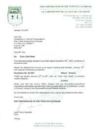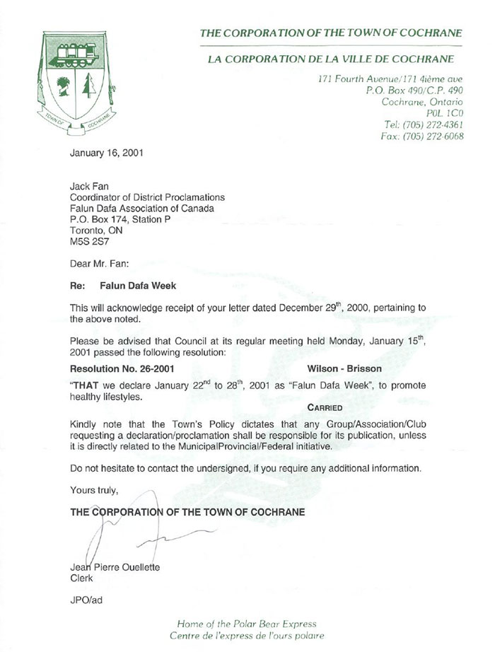 【明慧网2001年1月25日】 加拿大安大略省科克仁镇宣布2001年1月22-28日为“法轮大法周”
