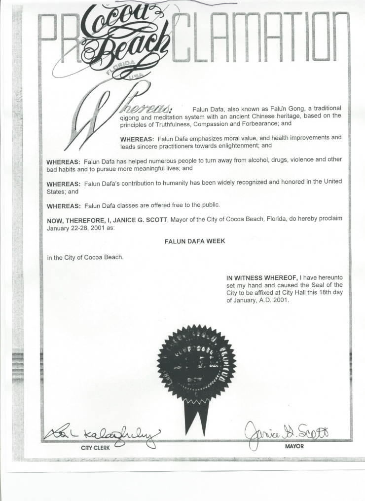 【明慧网2001年1月26日】 佛罗里达州可可市宣布2001年1月22-28日为“法轮大法周”