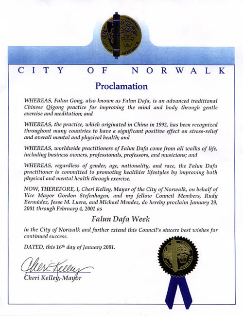【明慧网2001年1月26日】 加州诺沃克市宣布2000年1月29日 - 2月4日为“法轮大法周”。