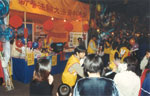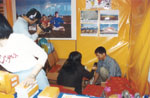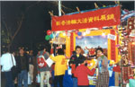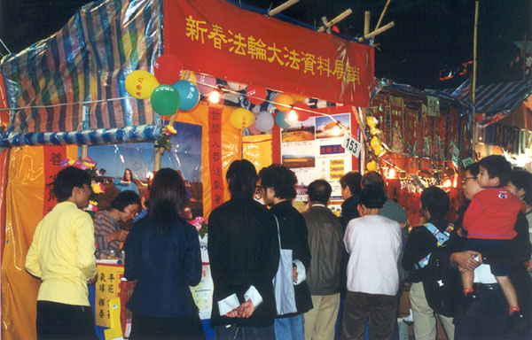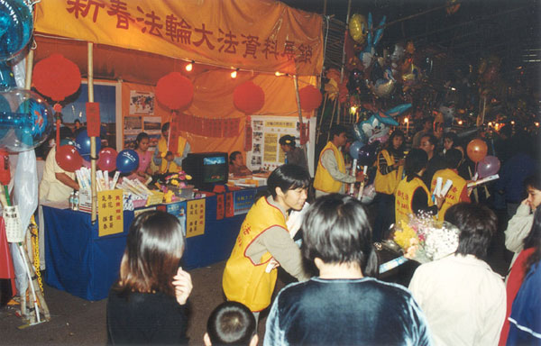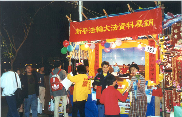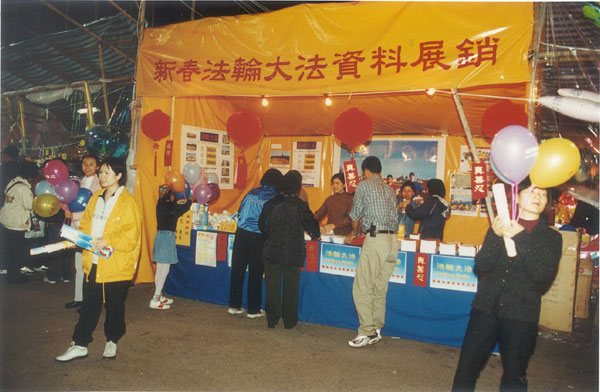 | 位于荃湾的“新春法轮大法资料展销”摊位显得与众不同,丝网印刷的“真善忍”格外引人注目 | 荃湾年宵摊档:在展销期间,学员们向游人出售大法书籍,并免费赠送法轮大法的年历、书签、莲花、印有“法轮大法、真善忍”的气球、“真善忍”的挥春和宣传资料“清流” |