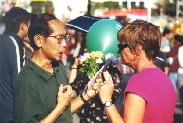 | 维多利亚公园:大多数家长们愿意接过法轮功的气球和莲花给他们的孩子,有的家长甚至教孩子读出“真善忍”三个字,并提醒孩子要记住“真善忍”。 | 维多利亚公园:学员向游客洪法 |