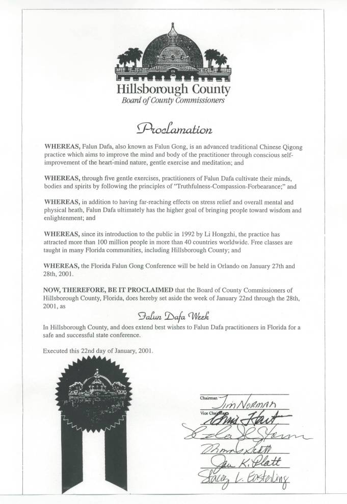 【明慧网2001年1月27日】 佛罗里达州荷姿宝罗郡宣布2001年1月22-28日为“法轮大法周”