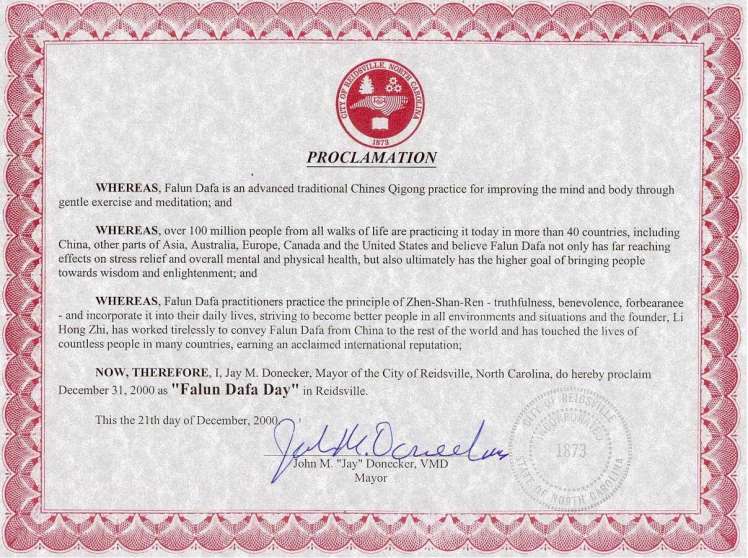 北卡罗来那州瑞兹维尔市宣布“法轮大法日”