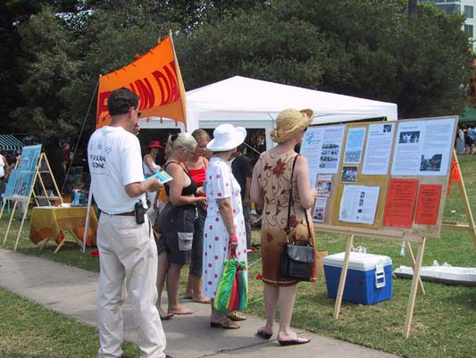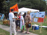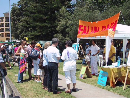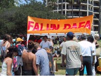 虽然五龙岗人很多都通过新闻宣传知道了法轮功,但他们还是非常感兴趣地驻足仔细阅读展示真象的图片资料。很多人也主动在阅读后签名表示支持。当日气温竟高达摄氏42度,学员们不顾炎热,在人群中传发资料,主动向行人和栖息在沙滩边的人们讲解大法真象,徵求他们的签名支持。当日洪法延续了六个多小时,我们的炼功和揭露邪恶的图片不断的吸引了大量的世人。