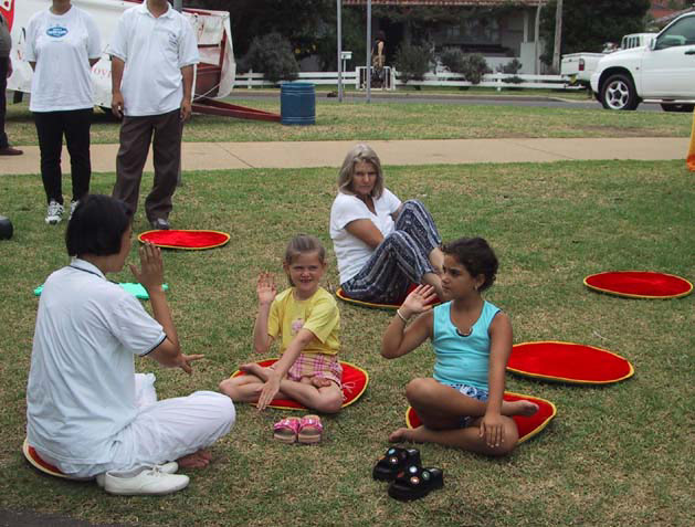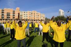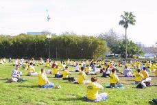 游行后,学员们在唐人街一个小广场集体炼功,吸引了大批人前来观看。有一百多人前来照像、几十人摄像。还有人已自学了一段时间了,这次提出了许多修炼方面的问题。学员当场教功,与许多人交了朋友,他们表示以后要继续来学功。