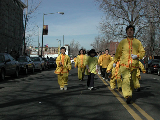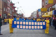 法轮功学员也象往年一样参加了游行活动。下午一点,游行开始了,约六十余名来自芝加哥地区的法轮功学员身着黄炼功服,手拉兰底黄字的横幅,走在游行的队伍中,鲜艳夺目中体现着中华文化的传统。今年学员们除了拉起写有“法轮大法”和“真、善、忍” 等字样的横幅外,同时又拉起了“法轮功学员祝芝加哥居民身体健康,吉祥如意”的横幅,更添节日气氛。道路两旁人山人海,法轮功成了人们目光的焦点。人们争相索要大法资料,在短短的十五分钟的行程中,学员们发出数千份大法简介。有的西方人问:“你们就是法轮功吗?”学员说:“是的,祝您新年愉快!”他说:“我支持你们,希望你们能坚持下去!”有人说:“真不能想象在中国会镇压这么美好、平和的功法。”“我在关注这事态的发展,你们真勇敢。”在主席台前,学员们表演了第一套功法,解说员详细介绍了法轮功,芝加哥的侨界领袖和市政要员观看了表演。