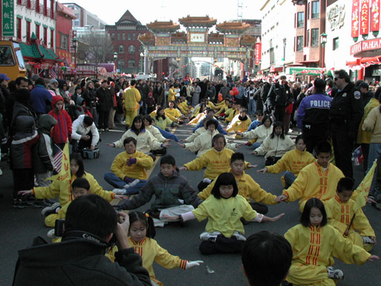 【明慧网2001年1月30日】 2001年1月28日下午,美国大华府地区侨界举行迎新春大游行,地点在中国城唐人街。首都华盛顿DC的市长,市议会主席,有关参议员及台北经济文化代表处程建人代表(相当于驻外大使)出席并致新年祝辞。由于本地区的法轮大法学员一直与华府侨界保持着非常良好的关系,同时我们一直是侨界各社团中重要的组成部份,因此我们这次被邀以年初刚刚成立的“明慧中文学校”的名义正式组团参加该活动。由于学员们都知道这是一次难得的洪法与讲清真象的机会,因此有超过50名弟子参加,同时大家准备了大量的有关宣传资料。