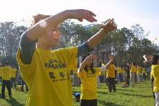 六名出来参加欢庆节的人周日也加入了身穿黄色服装的法轮功成员队伍,即兴学习了功法炼习。