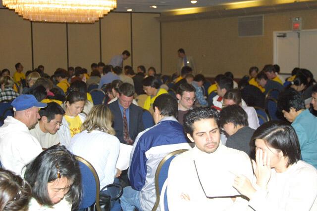 27日晚间,学员们夏里敦旅馆(Sheraton)进行了集体交流,大家分组学习了英文“李洪志师父在北美大湖区法会上的讲法”,然后集中讨论了如何作为“一个大法粒子”,以及如何“更好地‘助师世间行’、跟上正法进程”,西人学员踊跃发言,提出了很多很好的观点和做法,如更广泛地向社会各界说明真象,经常阅读明慧网(clearwisdom.net)以了解最新消息和新经文,从而跟上正法进程,更加积极地向大法网站投稿从而互相带动、整体提高等。