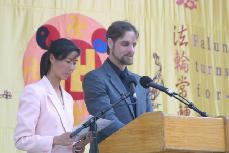 期间,一名男弟子作为学员代表,登台演唱了一首歌曲,以表达法轮大法学员友善和平的心声。