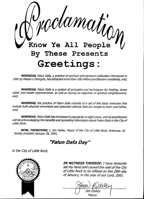 今天是阿肯色州首府小石城的“法轮大法日”。这是继去年7月20日阿肯色州的菲叶维尔(Fayetteville)市宣布“法轮大法日”以来对法轮功的又一官方褒奖。